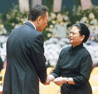 郭臺銘24日上午前往臺塑創(chuàng)辦人王永慶靈堂吊唁,并向三娘李寶珠(右)致意。(圖片來源:臺灣《聯(lián)合晚報》)