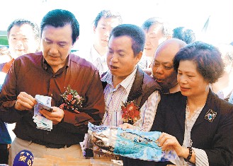 馬英九23日到宜蘭縣參加鯖魚節(jié)活動,當場掏出一迭鈔票,數(shù)了兩萬元買魚松、鹽漬鯖魚等產(chǎn)品,希望民眾也多消費。圖片來源:臺灣《聯(lián)合報》
