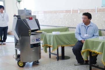 據(jù)臺(tái)灣媒體報(bào)道,這部點(diǎn)餐服務(wù)機(jī)器人,身高一百五十厘米,臺(tái)灣勤益科大電子系黃國(guó)興教授帶領(lǐng)四名同學(xué)以一年時(shí)間完成。機(jī)器人有臉部辨識(shí)系統(tǒng),有客人上門,就會(huì)主動(dòng)打招呼,機(jī)器人會(huì)查看哪里有空位,規(guī)劃最佳路徑,帶領(lǐng)客人到達(dá)指定桌號(hào),再透過觸控、聲控的方式進(jìn)行點(diǎn)餐,并將點(diǎn)好的菜單利用無線網(wǎng)絡(luò)傳送到柜臺(tái)、廚房。
