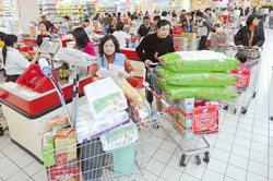 量販業(yè)者形容昨天是“最像假日的上班日”,尤其是夜間推出九折促銷,吸引不少民眾犧牲睡覺時(shí)間來(lái)采買,估計(jì)有二成來(lái)客選在凌晨消費(fèi)。家樂福夜間購(gòu)物滿2000元,再送200元折價(jià)券,各店從凌晨起收銀線即大排長(zhǎng)龍,汐止店甚至需排隊(duì)一個(gè)小時(shí)才能順利結(jié)帳。