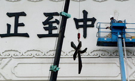 臺灣當(dāng)局拆除中正紀(jì)念堂“大中至正”牌樓內(nèi)外側(cè)共八個字,陳水扁甚至以太監(jiān)李蓮英來比喻:“被割掉了,還能裝回去嗎?”圖為“大”字被拆下時的情況。記者游順然/攝影