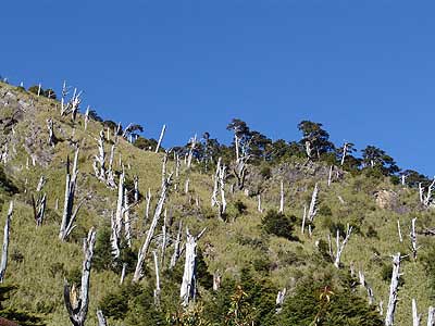 從塔塔加到排云山莊,最壯觀的景色之一,可能就是白木林了。位于距塔塔加步道口約5公里處之白木林,從觀景臺(tái)往山坡上望去,盡是一棵棵白色、孤寂矗立的枯木,白木林是森林遭受火焚后所殘余下來的枝干,經(jīng)過風(fēng)吹、日曬及雨淋等作用,樹皮逐漸剝落,只剩下白色木質(zhì)的一種特殊景觀。白木林主要樹種為冷杉和鐵杉,其中鐵杉較多,樹干挺直者為冷杉,樹干彎曲多分枝者為鐵杉。