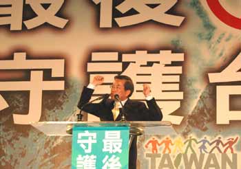 民進黨候選人謝長廷20日出席“最后一席、守護臺灣”晚會,強調(diào)未來的命運交給大家,如果沒當選也絕不落跑,會守護臺灣。 “中央社”圖