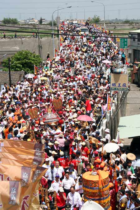 大甲媽祖繞境進香隊伍八日中午抵達目的地嘉義縣新港鄉(xiāng),數(shù)以萬計的信眾,擠滿云嘉交界的侖仔大橋。 “中央社”圖