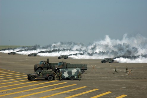 臺(tái)軍第五作戰(zhàn)區(qū)“漢光24號(hào)”演習(xí),23日在臺(tái)中清泉崗空軍基地舉行空降暨反空降演練。圖為煙幕排以五輛渦輪發(fā)煙車(chē),對(duì)空降場(chǎng)實(shí)施煙幕遮障。(“中央社”圖)