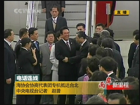 臺(tái)灣;鶗(huì)副董事長(zhǎng)兼秘書(shū)長(zhǎng)高孔廉與大陸海協(xié)會(huì)常務(wù)副會(huì)長(zhǎng)鄭立中等人到機(jī)場(chǎng)接機(jī)。