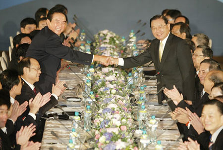 第二次陳江會登場,會前海基會董事長江丙坤與海協(xié)會會長陳云林握手致意。