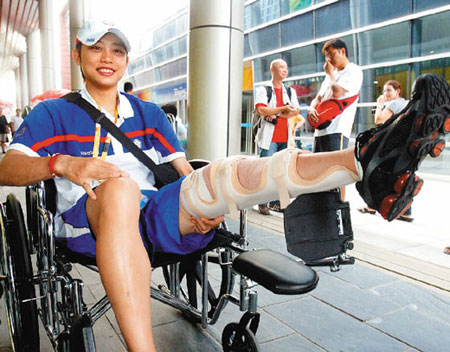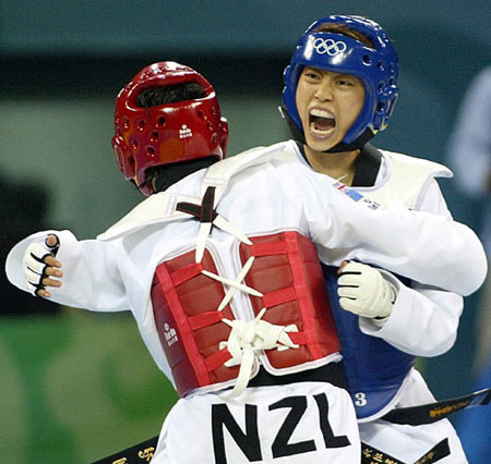 來自寶島臺灣的選手蘇麗文在跆拳道女子52公斤級復(fù)活賽中,帶傷出戰(zhàn)新西蘭選手。