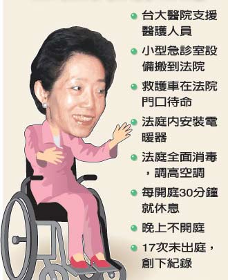 臺北地院這次更破天荒開庭30分鐘就讓吳淑珍休息一次,也就是開庭的第七法庭對面的第八法庭,將成為吳淑珍專屬醫(yī)療間,還擔(dān)心吳淑珍怕冷,出庭座位下還會放置暖爐。