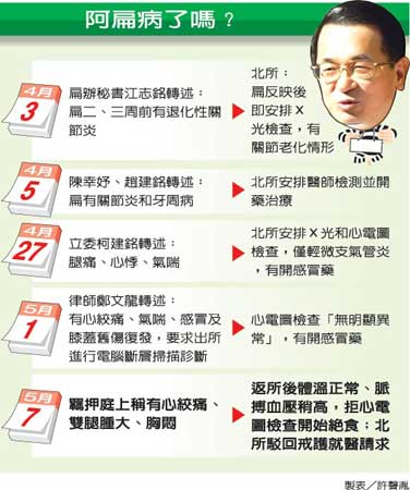 心臟學(xué)會秘書長、臺大醫(yī)院內(nèi)科主治醫(yī)師黃瑞仁指出,根據(jù)扁日前在北所接受心電圖檢查,發(fā)現(xiàn)他有心搏快速、心軸左偏及電位傳導(dǎo)偏低等現(xiàn)象,若血壓偏高或心肌病變,走路就會喘、冒冷汗,這可經(jīng)由心臟超音波診斷,“并不需要動用如扁辦所說的計算機斷層檢查”。