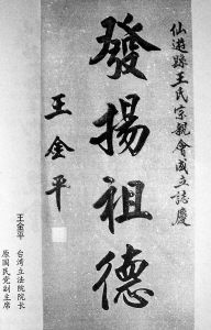 在日前舉行的仙游縣王氏文化研究會成立大會期間,仙游的王氏宗親們收到了來自臺灣王氏宗親王金平為王氏宗親會成立發(fā)來的賀呈。王金平的題詞是:發(fā)揚(yáng)祖德。(如圖)