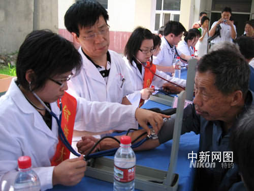 今日在六合區(qū)雄州市街道敬老院,長條課桌鋪開一溜,二十多個臺灣大學(xué)生著清一色白大褂,神情嚴(yán)肅認(rèn)真、儼然“大夫”模樣。在敬老院七十五個老人面前,他們詢病問傷,量血壓、針灸、開藥方,忙得不亦樂乎。