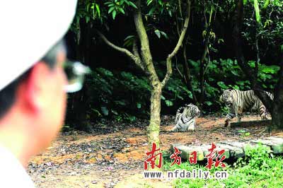 準(zhǔn)備送給高雄的兩只白虎為一公一母,公的叫“昭海”,母的叫“歡樂”?吹娇腿藖砹,“昭!焙汀皻g樂”不時站起來走幾步,秀秀身材;又不時把臉朝向觀眾,配合鏡頭。訪問團(tuán)成員紛紛站到鏡頭前,與兩只白虎來個“遠(yuǎn)距離合照”。