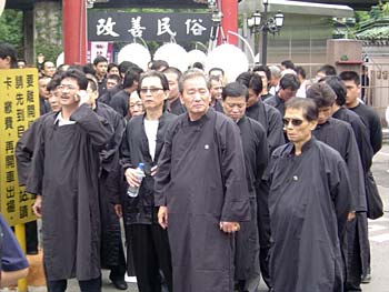 據(jù)臺灣中時電子報(bào)報(bào)道,2005年5月,在島內(nèi)素有“黑道仲裁者”之稱的“蚊哥”許海清舉行喪禮,全臺各幫派動員上萬人以“輸人不輸陣”的氣勢,身著各幫派及堂口制服,甚至以“黑色人龍”之姿繞街游行臺北街頭,甚至高調(diào)的舉辦記者會,訂定“黑道平安日”,讓警方顏面無光。太“警政署”最后施以鐵腕,日后的任何一場黑道份子喪禮,均事前強(qiáng)力約制幫派份子參加,甚至強(qiáng)力掃蕩,昔日黑道喪禮的風(fēng)光,幾乎已不復(fù)見。