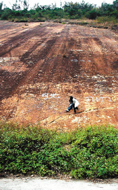 中新網(wǎng)12月18日電 南投縣中寮鄉(xiāng)“粗坑大峭壁”奇景,地質(zhì)專家推斷年代是古老的第三紀地層,已有三千萬年歷史,最近成為暴紅旅游景點。許多游客競相攀登峭壁還噴字,留字表示“到此一游”。當(dāng)?shù)鼐用窨匆娬滟F的地景遭到破壞相當(dāng)心疼。