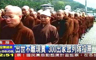 據(jù)臺(tái)灣媒體報(bào)道,10多輛大型游覽車(chē),載著中臺(tái)禪寺的300多名和尚、尼姑,一同抵達(dá)投票所。300多人列隊(duì)整齊排在投票所外等候。