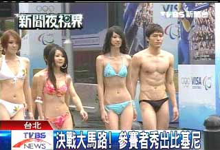 中新網(wǎng)4月29日電 據(jù)臺灣TVBS報道,臺北東區(qū)街頭28日下午出現(xiàn)清涼秀,電視比賽節(jié)目“決戰(zhàn)第一名”22名參賽者,把舞臺搬到大馬路上,直接把班馬線當(dāng)伸展臺走,參賽者身上只穿單薄比基尼走秀,路旁的行人則干脆拿手機(jī)拼命拍。