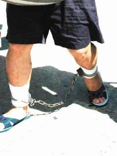 據(jù)稱,綠島監(jiān)獄規(guī)定所有新收受刑人從入獄當(dāng)天起得戴腳鐐?cè)齻(gè)月,表現(xiàn)好才解除,因腳鐐皆生銹,常有受刑人的腳磨破,細(xì)菌感染得到蜂窩性組織炎,腿腫得跟象腿一般,申請到臺灣就醫(yī),機(jī)票及醫(yī)藥費(fèi)還得自付。