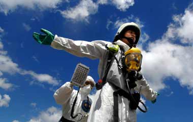 演習(xí)中舉行輻射彈爆炸處置,身著防護(hù)衣的臺(tái)軍部隊(duì)進(jìn)行輻射偵測