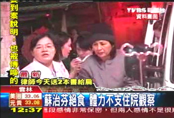 民進(jìn)黨籍云林縣長蘇治芬獄中絕食,已超過250個小時沒有吃東西,體力不支,兩度被送到醫(yī)院觀察。圖片來源:臺灣TVBS