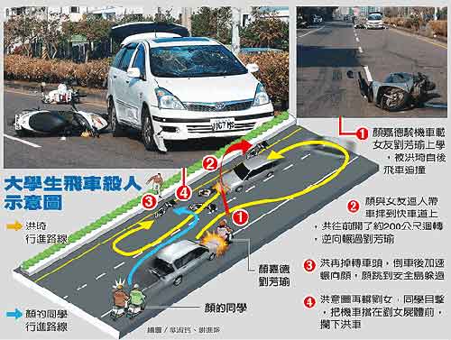 中新網(wǎng)12月19日電 據(jù)臺(tái)灣《聯(lián)合報(bào)》報(bào)道,臺(tái)灣臺(tái)南縣致遠(yuǎn)管理學(xué)院大三學(xué)生洪琦不滿女友分手,昨天駕車尾隨情敵顏嘉德與前女友劉芳瑜的摩托車,撞倒兩人后,再回轉(zhuǎn)輾過前女友,致前女友當(dāng)場(chǎng)慘死。