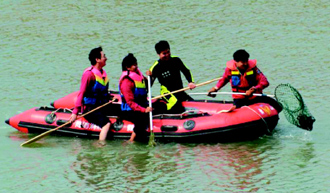 岸上圍觀民眾擔(dān)心它會(huì)淹死而目睹了一場(chǎng)不一樣的抓猴記。警義消拿出網(wǎng)子朝小獼猴撒網(wǎng),終將它“撈”上橡皮艇,“抓猴劇”半小時(shí)落幕。
