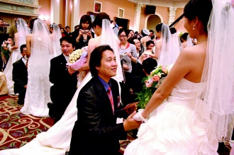 中新網(wǎng)4月16日電 據(jù)臺灣《聯(lián)合報》報道,花蓮縣15日在舉辦集體結婚,全縣100對新人完成終身大事,有日本郎娶臺灣美嬌娘,也有佛教醫(yī)院人員娶基督教醫(yī)院護士,新人在微微的細雨中走過許愿池,誓言情愛一生。