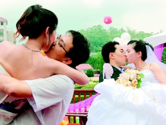 婚禮結(jié)束后舉辦趣味比賽,新郎抱起新娘親吻比久,原先取前三名,結(jié)果十多對(duì)都通過“考驗(yàn)”,通通有獎(jiǎng),他們說:“她不重,她是我老婆!”