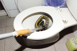 中新網(wǎng)5月11日電 一朝被蛇咬,十年怕馬桶?據(jù)臺灣《中國時報》報道,住南投埔里鎮(zhèn)山區(qū)的林姓男子,日前坐馬桶小解時,突感下體一陣劇痛,回頭赫見一條巨蛇躲在馬桶里昂首吐舌信,咬破他的陰囊鮮血直流,趕緊負(fù)傷求助鄰人送醫(yī);醫(yī)生說所幸黑眉錦蛇無毒,否則連小命也不保。