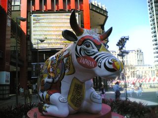 今年生肖牛年,搭配牛年,臺(tái)北市文化局協(xié)辦的“2009臺(tái)北奔牛節(jié)、奔牛入市、放養(yǎng) ”活動(dòng).由兩只牛拼奏成一頭奔跑的牛藝術(shù),另外全世界最大的牛,長(zhǎng)、高四米六、兩米五,則現(xiàn)身在信義商圈,藝術(shù)家創(chuàng)作的主軸為平安牛,上頭畫滿臺(tái)灣傳統(tǒng)的民俗圖騰。國(guó)際文創(chuàng)執(zhí)行長(zhǎng)陳秉鴻表示,臺(tái)北市是全世界第六十五個(gè)城市舉辦奔牛節(jié)活動(dòng),為了凸顯臺(tái)灣文化,臺(tái)北奔牛節(jié)充滿亞洲創(chuàng)意元素。