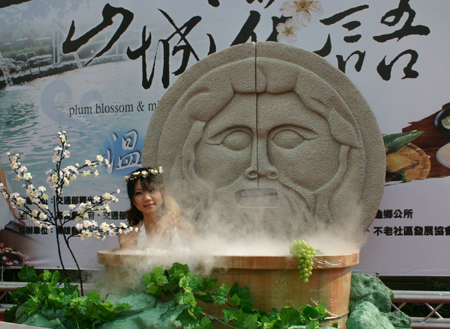 臺灣高雄縣溫泉餐飲業(yè)者推出“山城花語溫泉季”活動(dòng),四日記者會(huì)中的辣妹泡湯,凸顯活動(dòng)主題!爸醒肷纭眻D 陳守國 攝