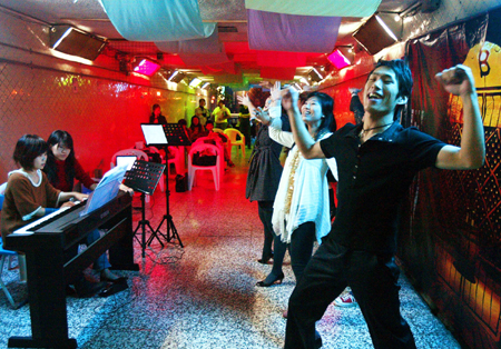 臺灣師范大學前師大路、和平東路口的“師大和平地下道”再度變身,二十日晚間舉行“圣誕老人從地底竄出——圣誕百老匯音樂狂歡夜”,學生演出圣誕音樂劇及歌曲,過往民眾享受節(jié)日氣氛!爸醒肷纭眻D 孫仲達 攝