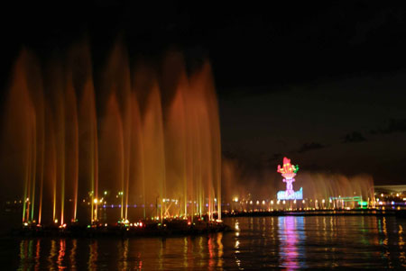 高雄燈會藝術節(jié)二日閉幕,閉幕前再表演水舞秀供民眾觀賞!爸醒肷纭眻D 陳朝福 攝