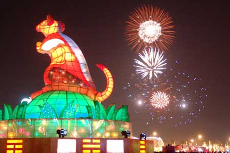 2008臺(tái)灣燈會(huì)二日晚間在臺(tái)南縣閉幕,主燈“禮鼠獻(xiàn)瑞”在最后一次展演后熄燈!爸醒肷纭眻D 楊思瑞 攝