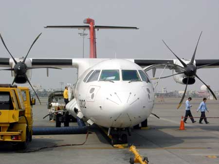 油價居高不下加上高鐵沖擊,令臺灣航空業(yè)者的“寒冬”雪上加霜,部分航空公司改以雙螺旋槳飛機(jī)飛航島內(nèi)航線!爸醒肷纭眻D 程啟峰 攝