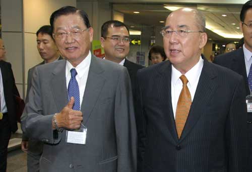 中國國民黨主席吳伯雄(右)五月三十一日結(jié)束在大陸的訪問行程返臺,海基會董事長江丙坤(左)特別前往接機(jī),并豎起大拇指高度肯定此行的成果。(“中央社”圖)