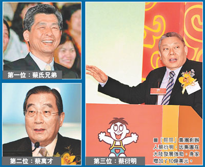 今年上榜富豪中僅5人錄得資產(chǎn)增長,當中3人得益于大陸業(yè)務發(fā)展!按筅A家”是旺旺集團創(chuàng)辦人蔡衍明,集團在大陸發(fā)展強勁,身家急漲10億美元,排名從第9名跳升至第3名。另一食品集團康師傅的創(chuàng)辦人魏應州,身家也大增5.5億美元,升至第5名。