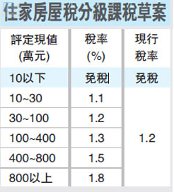 根據(jù)“財(cái)政部”所擬草案,房屋評(píng)定現(xiàn)值在10萬元以下者,仍維持免稅;超過10萬元以上的住家用房屋,房屋稅將分為五級(jí)課稅,稅率分別是1.1%、1.2%、1.3%、1.5%及1.8%。