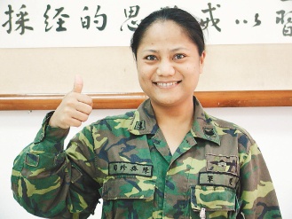 38歲陳梅珍從小想當(dāng)護士,中學(xué)畢業(yè)考上護專,但學(xué)費貴,家里無力負擔(dān)。念完高中后,為減輕父母負擔(dān),入伍成為臺軍首批志愿役女士官。現(xiàn)在是陸軍空降訓(xùn)練中心士官長,去年協(xié)助訓(xùn)練連上人員,獲得“莒光連隊”殊榮。