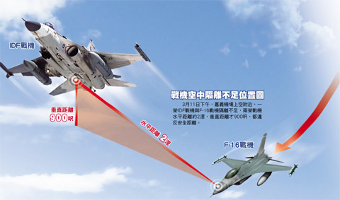 空軍臺南聯(lián)隊(duì)1架IDF戰(zhàn)機(jī)編隊(duì)飛行未依塔臺管制,在4000呎高空與嘉義聯(lián)隊(duì)1架F-16戰(zhàn)機(jī)相距僅約900呎,發(fā)生嚴(yán)重隔離不足。