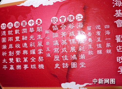 ;鶗(huì)為晚宴特制一份“藏頭詩”菜單:“江海歡騰彩滿堂/陳谷成偶展鴻圖/會(huì)合精英成佳話/談協(xié)論議寫歷史/臺(tái)閣生風(fēng)掌契機(jī)/中華光彩耀全球/圓潤融通興萬事/滿載豐收齊歡樂/成就兩岸創(chuàng)雙贏/功德圓滿祈太平”,以每句詩的頭一個(gè)字組成“江陳會(huì)談.臺(tái)中圓滿成功”。
