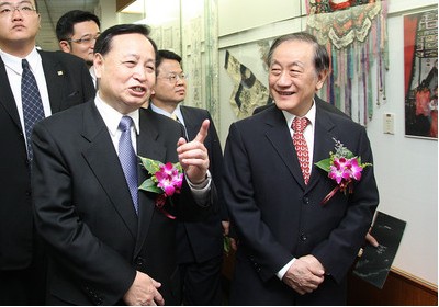 湖北省省委書記羅清泉、新黨主席郁慕明、前;鶗(huì)副董事長(zhǎng)焦仁和、大陸當(dāng)代畫家周韶華和臺(tái)灣藝術(shù)家李奇茂等,21日上午皆出席“2010臺(tái)灣湖北 (武漢)周─荊楚文化聯(lián)展”開幕式典禮。