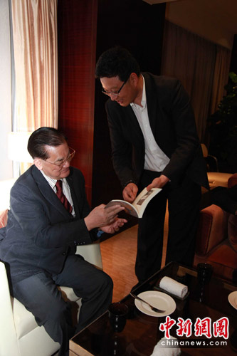 中新網(wǎng)杭州5月2日電 (記者嚴(yán)格)正在杭州參訪的中國(guó)國(guó)民黨榮譽(yù)主席連戰(zhàn)5月2日晚在其下榻的賓館會(huì)見(jiàn)了中新社浙江分社社長(zhǎng)王旻及多次采訪連戰(zhàn)的分社記者,并接受了由中新社浙江分社與浙江省臺(tái)辦共同編撰的《浙臺(tái)口述歷史》一書(shū)。