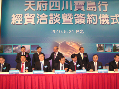 四川省工業(yè)經(jīng)濟(jì)聯(lián)合會(huì)與工業(yè)總會(huì)、臺(tái)灣區(qū)電機(jī)電子工業(yè)同業(yè)公會(huì)等川臺(tái)經(jīng)貿(mào)、旅游、農(nóng)業(yè)、文化團(tuán)體,上午共簽署5份合作協(xié)議!百Q(mào)協(xié)”下午在臺(tái)北國際會(huì)議中心舉辦川臺(tái)采購洽談會(huì),預(yù)計(jì)安排上百場(chǎng)1對(duì)1洽談。