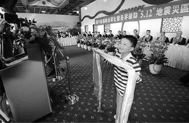 5月24日下午,一次特別的聚會(huì)——四川省感謝臺(tái)灣社會(huì)各界援助“5·12”地震災(zāi)區(qū)見(jiàn)面會(huì)在臺(tái)北圓山飯店昆侖廳舉行。曾經(jīng)深入“5·12”汶川特大地震災(zāi)區(qū)的臺(tái)灣救援隊(duì)、醫(yī)療隊(duì)、志愿者、援建單位和文娛界以及媒體代表歡聚一堂,回憶和感受血濃于水、兩岸一心的同胞情深。