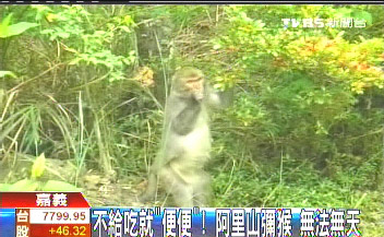 中新網12月21日電 據(jù)臺灣TVBS報道,阿里山現(xiàn)在也出現(xiàn)彌猴,猴子為了吃東西,還會雙手合十拜托民眾給香蕉吃,不過看到民眾不肯給,猴子居然調皮的,跳到民眾的車子上排泄,甚至還會把山上的花摘來吃,讓民眾好氣又好笑。
