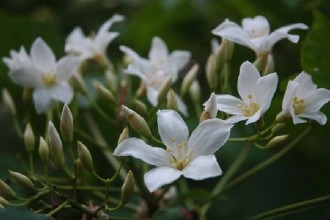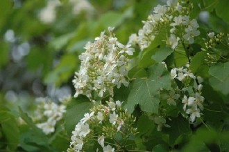 油桐樹開的花,被愛花人昵稱“桐花”,花開時白花成簇堆聚綠葉上頭,有如冬雪輕覆枝頭,加上花朵隨風(fēng)吹飄落,模樣更像是雪花,因而贏得“夏雪”美名,雖然四月便見桐花開,但因盛花期落在五月間,又有“五月雪”的封號。