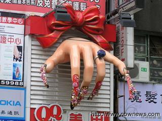 中新網(wǎng)6月23日電 據(jù)臺(tái)灣“今日新聞”報(bào)道,桃園市某家美甲業(yè)者招牌頗具創(chuàng)意,一只巨大的左手正高高掛在店門之上,還特別做個(gè)蝴蝶結(jié),宛如天上掉下來的禮物,每當(dāng)民眾經(jīng)過此店,總是會(huì)留意一下如同仙女般的左手。