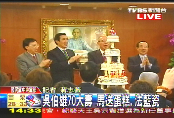 中新網6月17日電 據臺灣TVBS報道,19日是國民黨主席吳伯雄70歲的生日,國民黨今天(17日)提前替吳伯雄慶生,馬英九也到場送上大蛋糕和禮物。