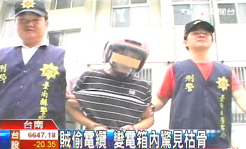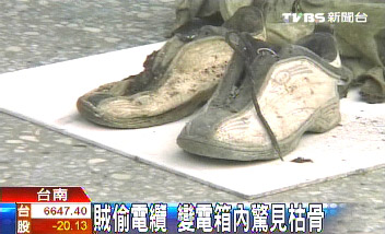 據(jù)臺(tái)灣TVBS電視臺(tái)報(bào)道,臺(tái)南縣一名小偷潛入歇業(yè)的工廠偷電纜,意外發(fā)現(xiàn)變電器箱里竟有一具白骨。據(jù)臺(tái)灣警察分析,死者可能是要偷電纜意外觸電,死亡時(shí)間超過(guò)2年;發(fā)現(xiàn)白骨的竊賊,也因?yàn)榱粼诂F(xiàn)場(chǎng),通緝犯身份曝光,被帶回警局。